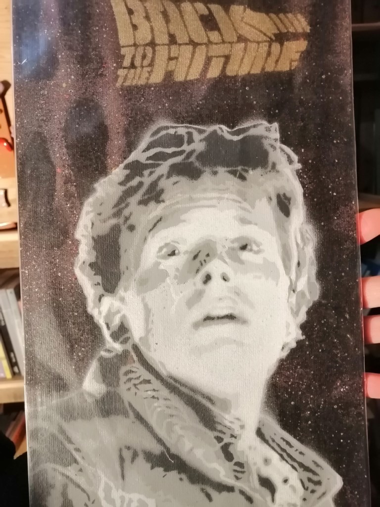 Back to the future, tavola dipinta con stencil, di Yest