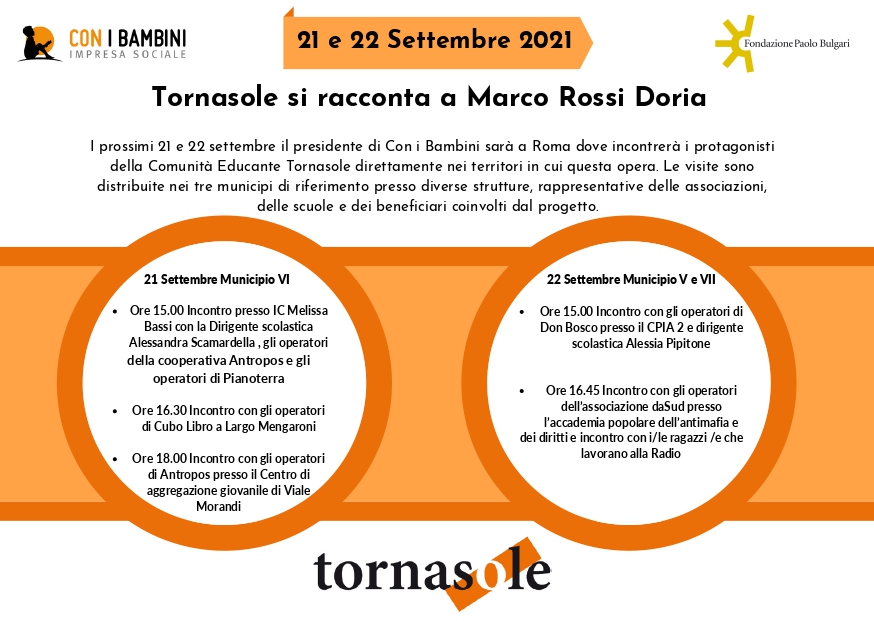 Organizzata in coincidenza con la riapertura dell’anno scolastico e il riavvio delle attività di progetto, la visita di Marco Rossi-Doria si configura come un’occasione di ascolto dei bisogni e delle istanze della comunità educante, in un momento tuttora fortemente segnato dagli strascichi e dalle preoccupazioni della pandemia, secondo un itinerario che si snoderà attraverso alcuni luoghi e strutture chiave del progetto.